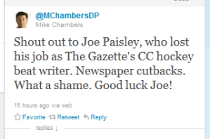 What is happening has forced me to ask some introspective questions about people like myself, who won’t be going back to work on Monday. Two instances brought these questions up: earlier this week I read about buyouts at the Denver Post, including theater critic John Moore, who wrote a poignant piece about his departure. Then, as I sat down Friday night to watch Denver-Colorado College hockey, a tweet came across my timeline – the aforementioned layoffs at the Colorado Springs Gazette. Layoffs that included the once-great paper’s college hockey writer. (Notice that the Gazette’s story didn’t include the mention or the number of people who lost their jobs – but the comments, some written by former Gazetteers, did.)